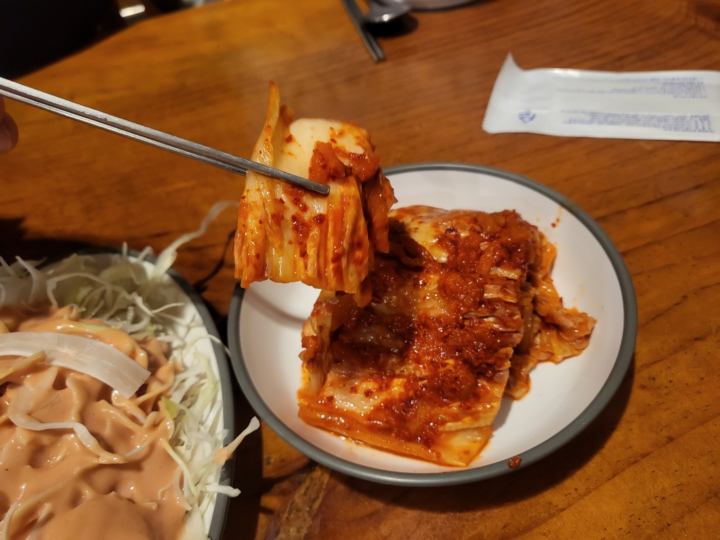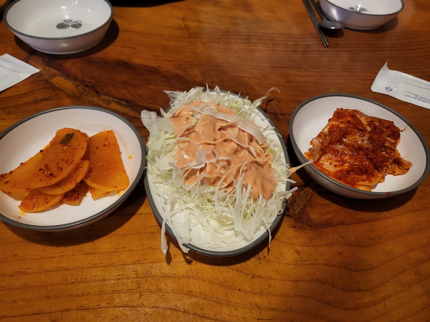 단무지와 샐러드를 보면 맛집이구나 합니다. 단무지 양념해주는 곳 별로 없죠 ㅋㅋ 단무지와 샐러드를 3번은 더 먹었어요. 샐러드 소스 보이시죠? 듬뿍듬뿍 뿌려주시네요.