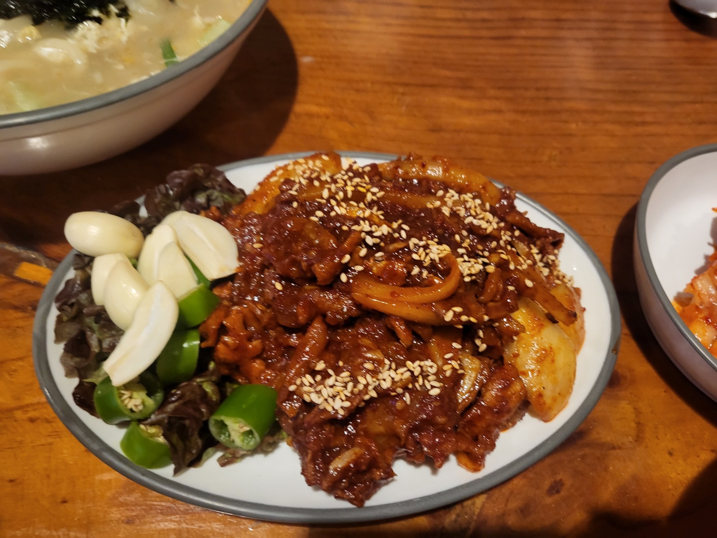 동그란 주먹밥에 오돌뼈를 살짝 올려 먹으니 맛이 기가 막히다는 표현이 제격이긴 할까요?